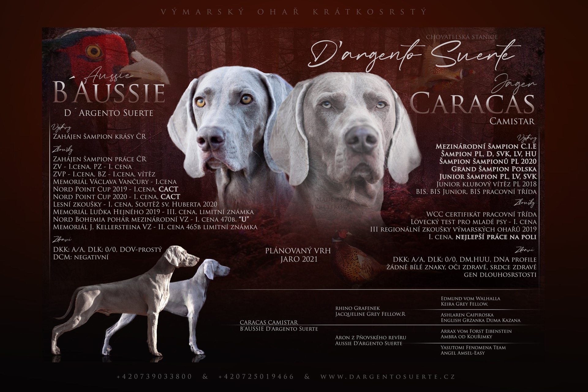 If everything goes as we wish, the puppies should be born in the fall of 2022. The mother of the planned litter ``E`` will be our Týnka (Bastet D`Argento Suerte). The father will be the Spanish dog Romeo (Great Hermes Tierra del Viento)